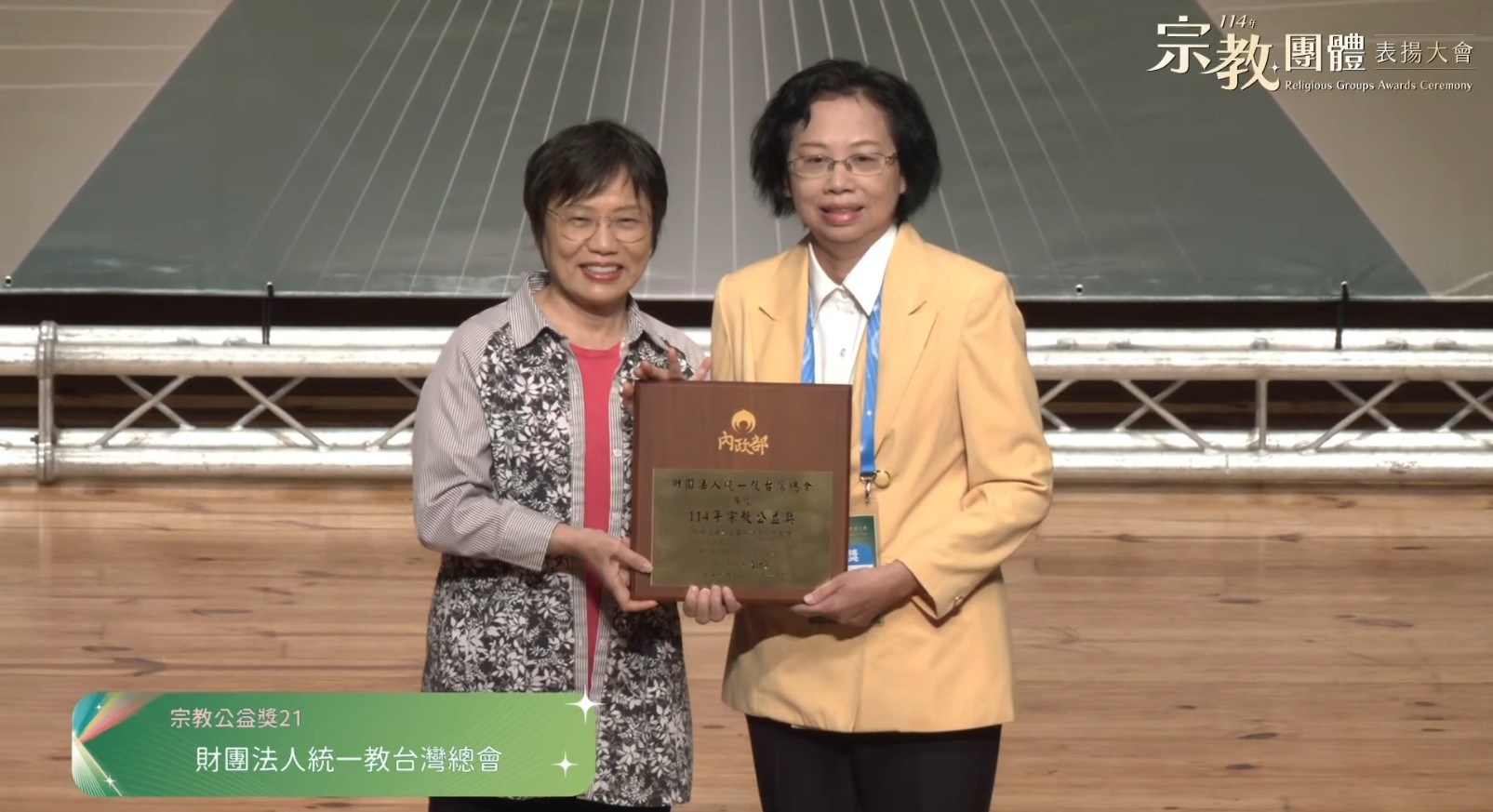統一教連續第25年獲頒績優宗教團體獎項 「114年宗教團體表揚大會」8月22日於屏東藝術館舉行,內政部部長劉世芳親自出席並給予頒獎。恭喜獲獎的多個宗教團體!「統一教台灣總會」已經連續第25年獲頒績優宗教公益獎項,今年由屏東教會長代表領獎。績優宗教團體表揚的條件主要包含:參與社會公益達一定規模績效,並合乎相關法令的規定等。感謝社會各界人士與會員們,對於本會組織所發起的各項公益活動的精誠努力與付出!