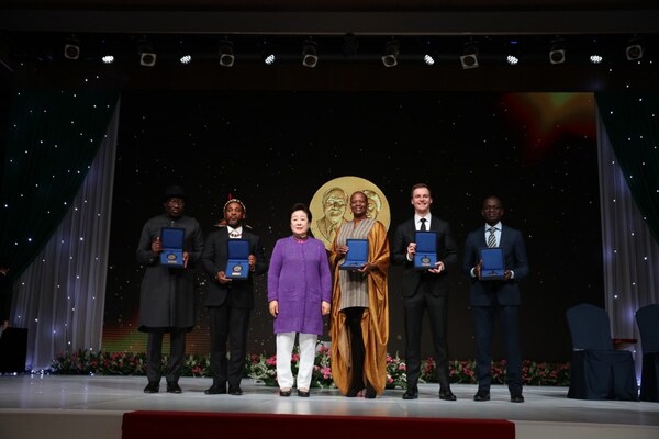 From left to right (H.E. Goodluck Jonathan, Dr. Samuel Radebe, Dr. Hak Ja Han Moon, Dr. Wanjira Mathai, Mr. Hugh Evans, Dr. Patrick Awuah, Jr)